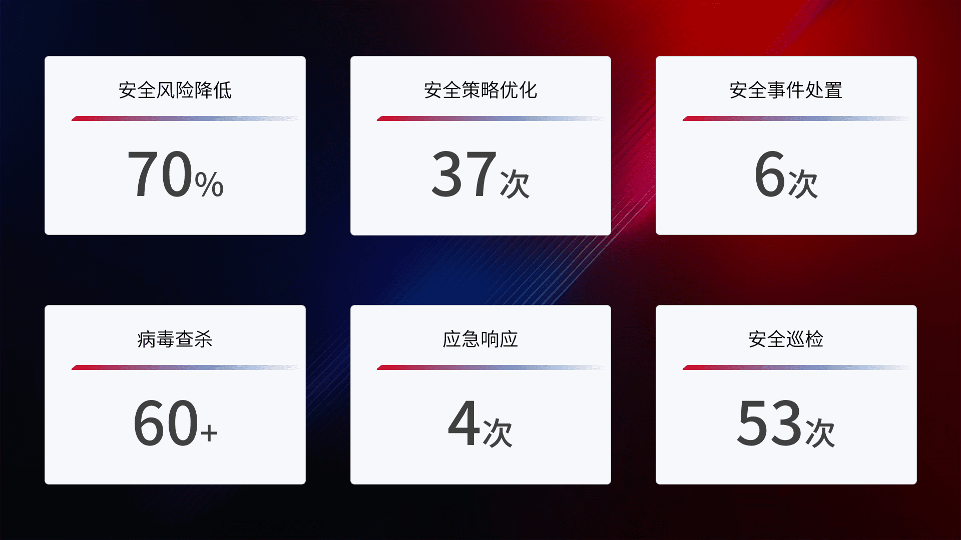 提供全面的安全事件报告体系,,包括处置报告、、周报、、、季度和年度总结,,,,结合持续监控,,,,帮助客户深入了解网络安全状况。。。。